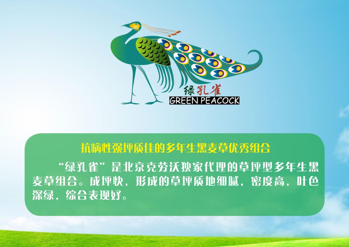 “綠孔雀”適應性強,用途廣泛。單播或與其它多年生黑麥草品種、早熟禾、細羊茅等混播效果都很好。適用于庭院和公園等草坪的建植。